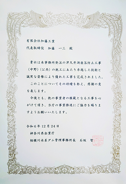 | 令和5年度 | 神奈川県企業庁相模川水系ダム管理事務所 | 津久井湖崩落防止工事 (中野)(公共) | 法面補強工事 |